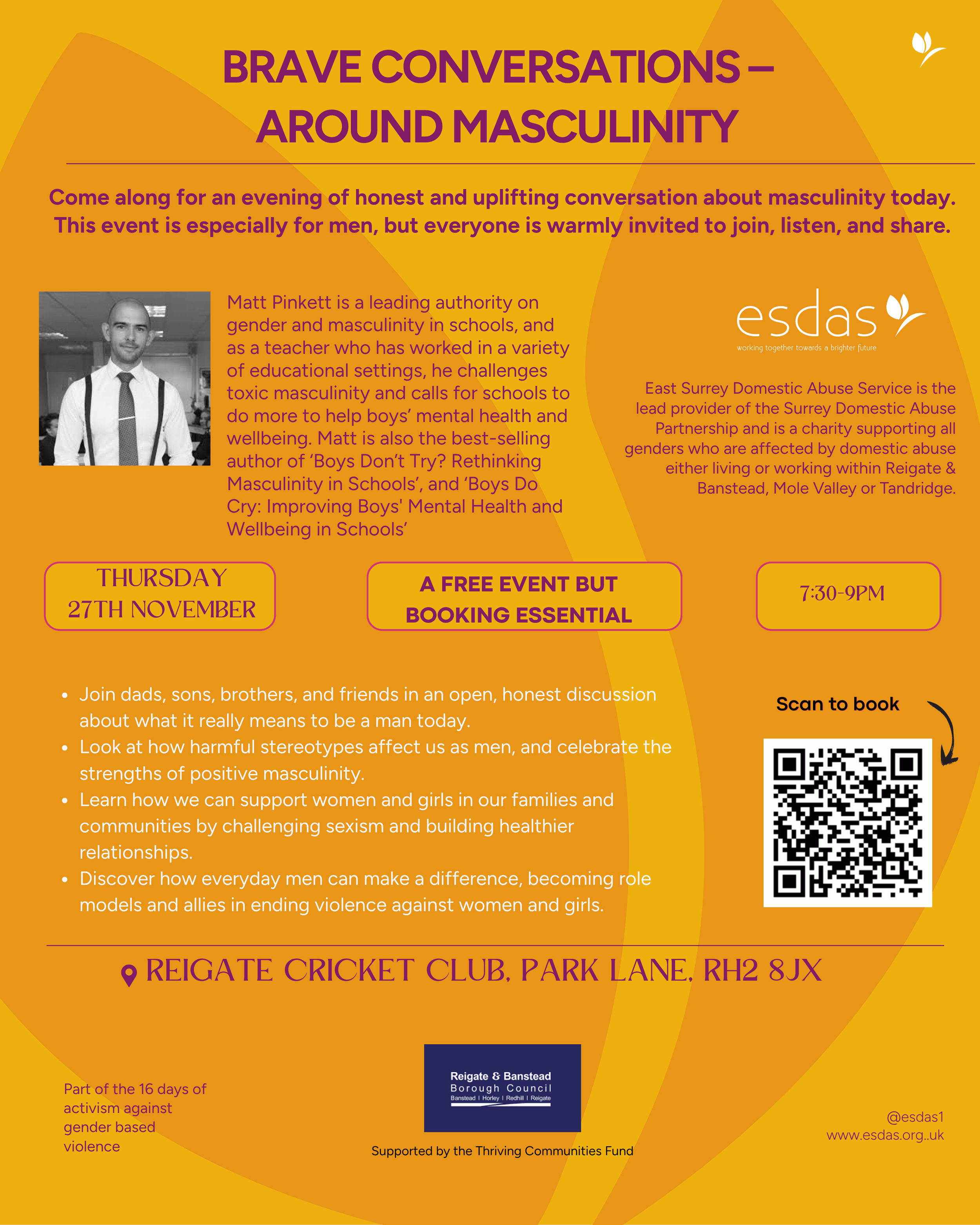 This event is open to all but particularly invites men and boys to have an open, honest conversation about what it means to be a man today, the pressures, the positives, and the power we have to make change. Together, we can shape a culture where everyone feels safe, respected, and valued. More information and to book your free ticket use the link here
